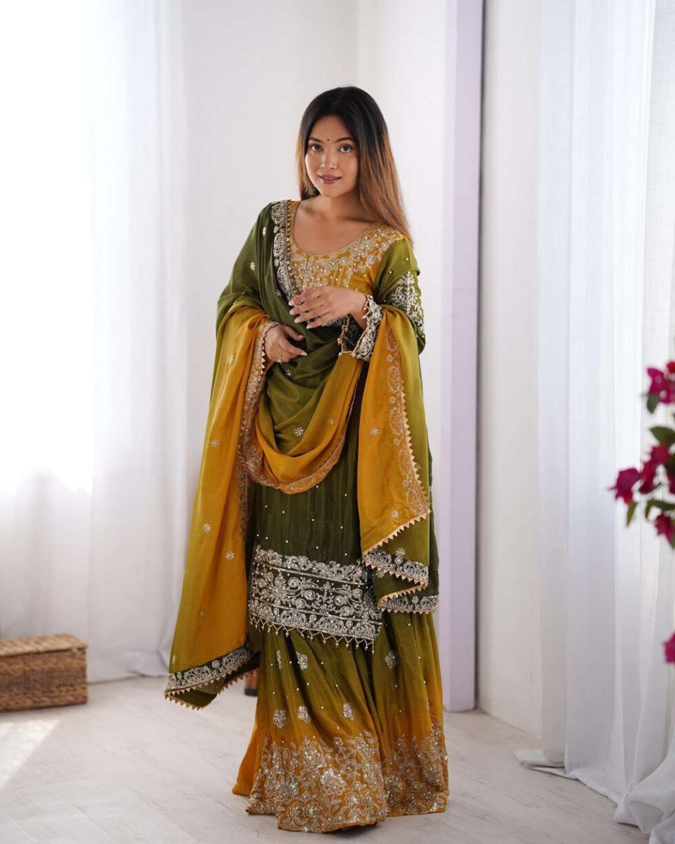 Women’s Chinon Silk Sequence With Rivet Moti Work Straight Kurta With Sharara and Dupatta Set